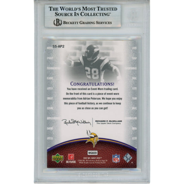 The number in the listing title is just an inventory sku for our records and is not the authentication number. The item pictured is the exact item you will receive, please see photos for condition. This is a Minnesota Vikings 2007 Upper Deck Sweet Spot #SS-AP2 Slabbed Trading Card that was personally autographed by Adrian Peterson. Includes a certificate of authenticity from Beckett Authentication Services (BAS) and Denver Autographs.FREE SHIPPING within the USA on orders over $10!