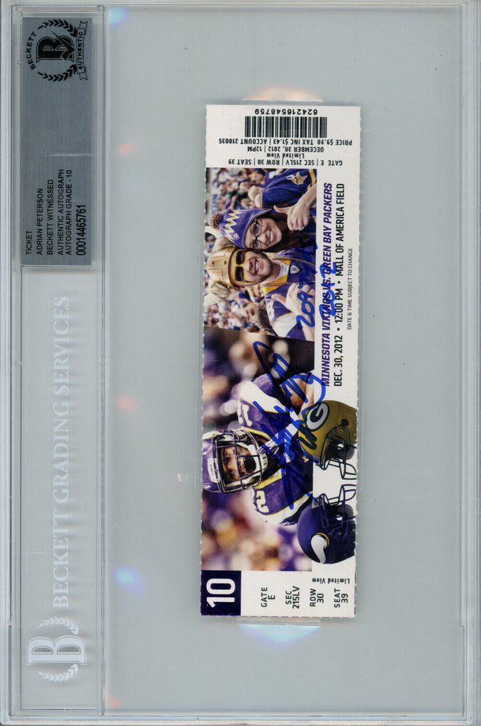 Adrian Peterson Autographed 12/30/2012 Ticket Stub 2097 Yds Beckett Slab 38633 The number in the listing title is just an inventory sku for our records and is not the authentication number. This is the exact item that you will receive so please see pictures for condition. This is a ticket stub that was personally autographed by Adrian Peterson with 2097 yards inscription. This has been professionally slabbed by Beckett Authentication Services (BAS) and includes a certificate of authenticity from Denver Autographs.