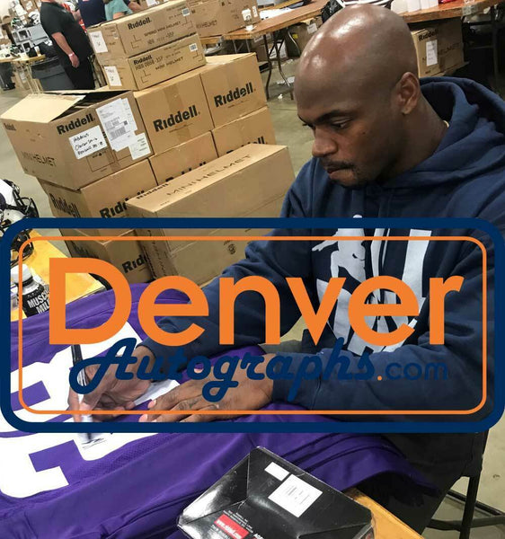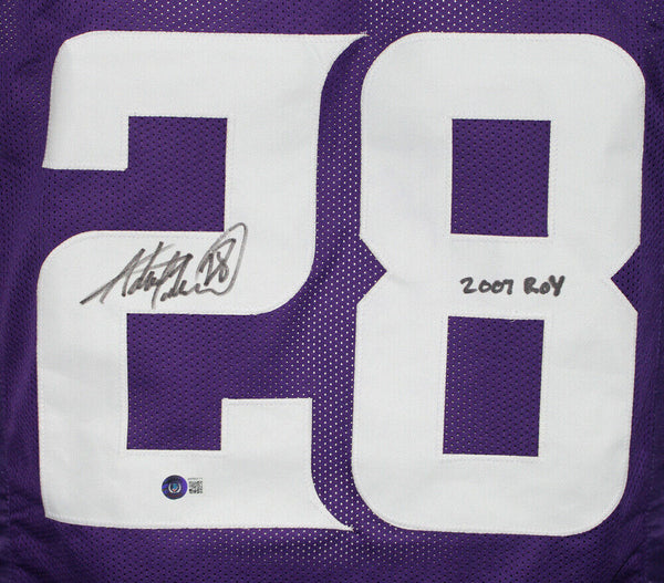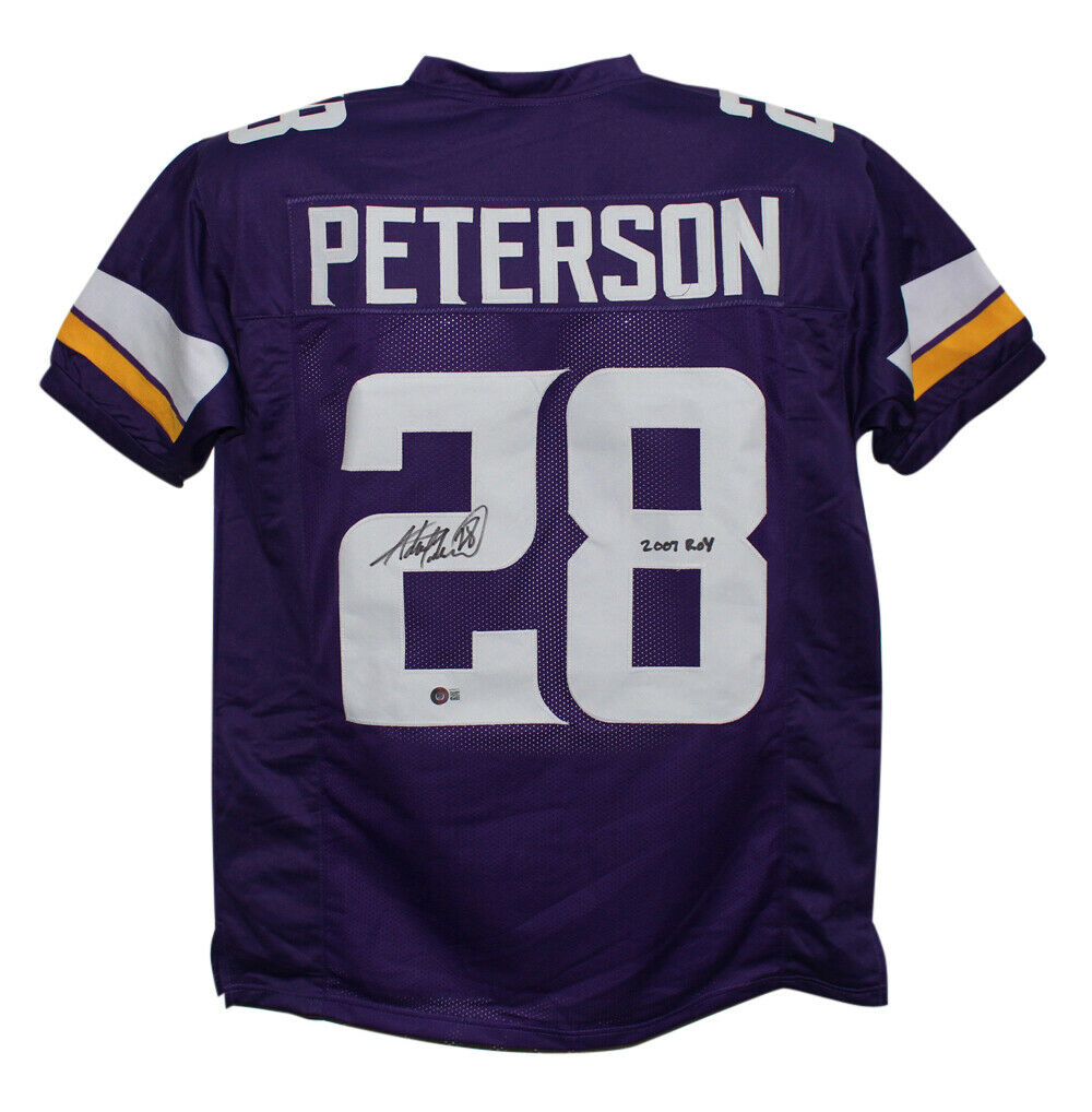 Adrian Peterson Autographed Pro Style Purple XL Jersey 2007 ROY BAS 33993 The number in the listing title is just an inventory sku for our records and is not the authentication number. This is a custom pro style purple XL jersey with sewn on name and numbers that was personally autographed by Adrian Peterson. Includes a certificate of authenticity from Beckett Authentication Services (BAS) and Denver Autographs.