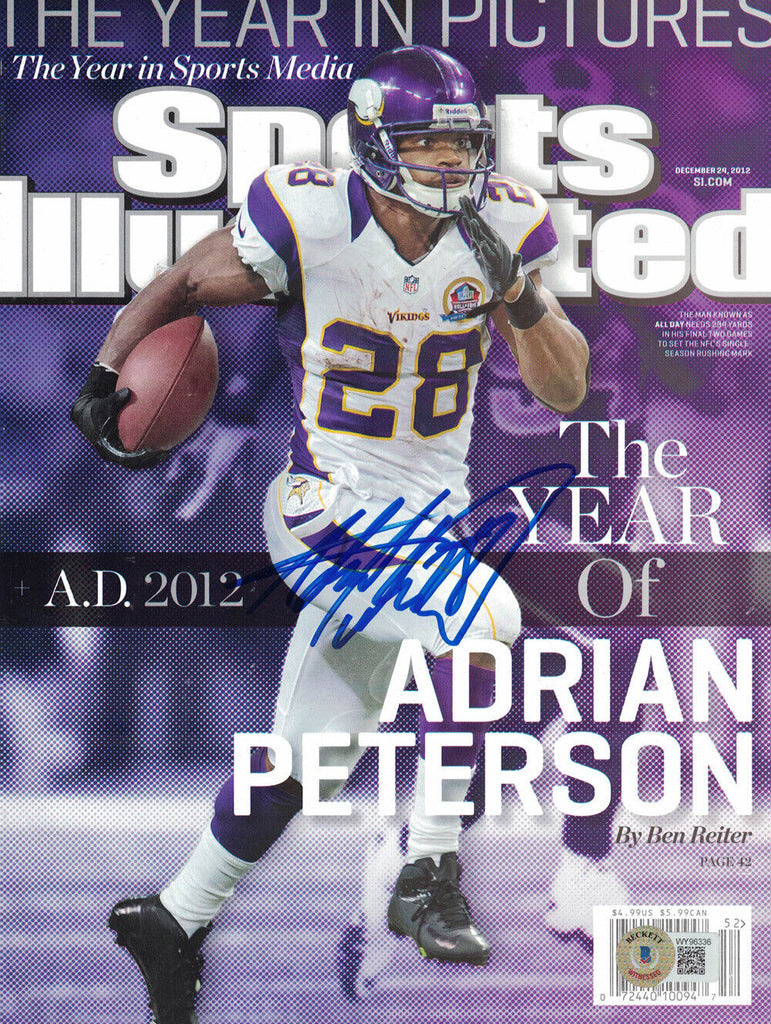 Adrian Peterson Signed 12/24/2012 Sports Illustrated Magazine No Label BAS 38910 The number in the listing title is just an inventory sku for our records and is not the authentication number. The item pictured is a stock photo unless otherwise noted. This is a Sports Illustrated magazine issue from December 24, 2012 that was personally autographed by Adrian Peterson. Includes a certificate of authenticity from Beckett Authentication Services (BAS) and Denver Autographs.