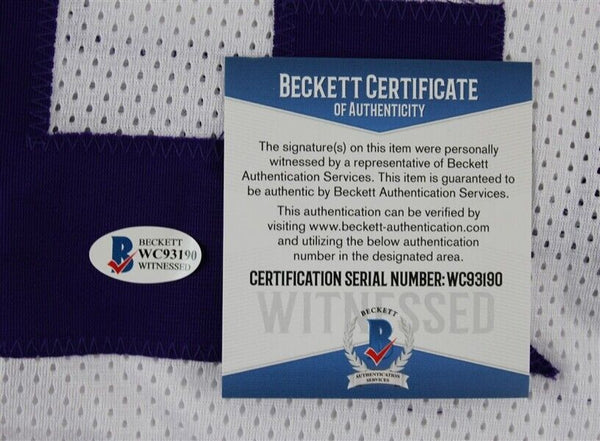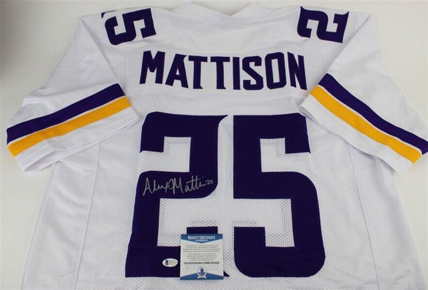 This autographed jersey has been personally hand-signed by Alexander Mattison of the Minnesota Vikings. This autograph is certified by Beckett Authentication Services (BAS) Witness Certification. That means that a Beckett representative was present when this item was signed. It comes with the numbered authentication hologram and matching Certificate of Authenticity. Custom on-field style jerseys are a more affordable option for autograph seekers. These jerseys do not have any brand name or tags and are made in the Philippines. They feature stitched on names and numbers and are made to look very similar to the on-field jerseys that the players wear. These custom jerseys are very commonly used in the memorabilia industry.