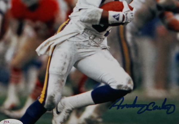 Anthony Carter Signed Minnesota Vikings 8x10 Running PF Photo- JSA W Auth *Blue This is a Hand Autographed 8x10 Photo of Anthony Carter of The Minnesota Vikings. This item has a James Spence Witness Protection Authentication, which Comes with a JSA #'ed Sticker and a Matching JSA COA. You can view this item on the SpenceLOA website and it shows when and where the item was signed It was signed either at a public autograph appearance or a Private Signing. This is a stock photo of the item. Although you may not receive this exact item, the item you receive is virtually identical and brand new in great shape.