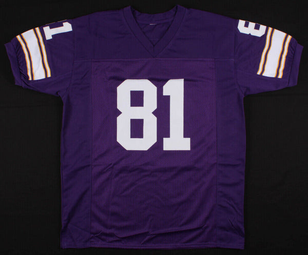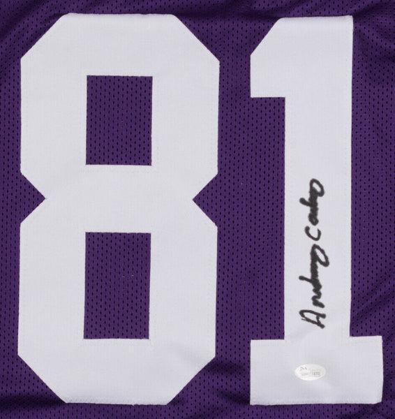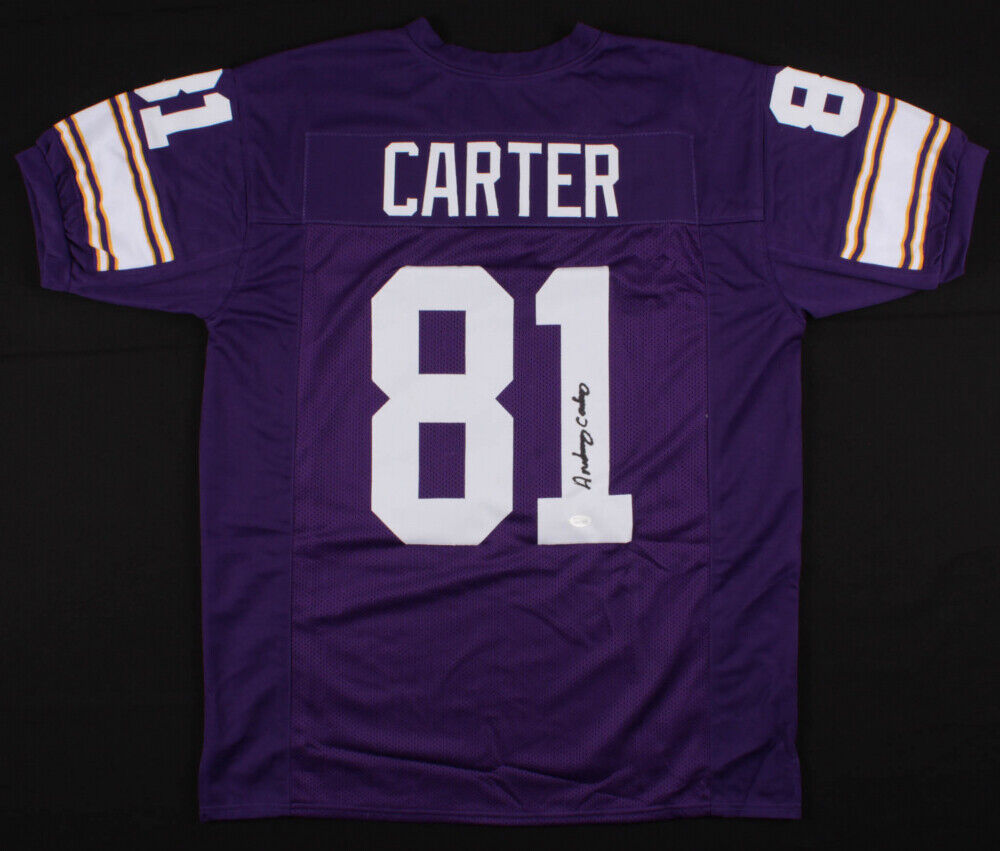 Custom on-field style jersey. Everything sewn on, size XL. Hand signed in black felt-tip pen by Anthony Carter. The autograph includes an official James Spence Authentication (JSA) hologram and matching COA for authenticity purposes. The signing of this item was witnessed by JSA.Authentication: JSA COA