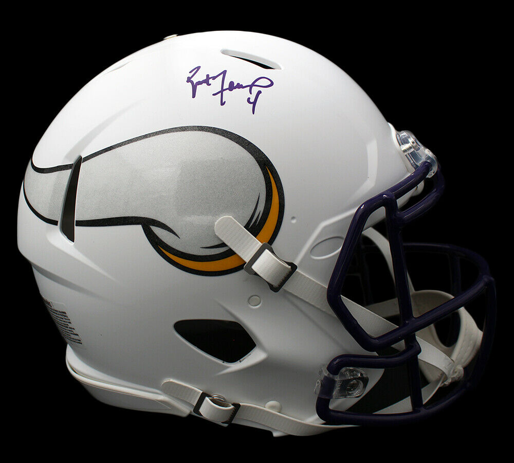 A Minnesota Vikings Speed Authentic White Matte NFL Helmet hand signed by Brett Favre. The item and signature are in excellent condition. Brett is one of the most iconic players in NFL history. A 20 year veteran of the NFL, Brett is a Super Bowl Champion, 11x Pro Bowler, 3x AP NFL Most Valuable Player, 4x NFL passing touchdowns leader, and 2x passing yards leader. His number, 4, has been retired by both the Green Bay Packers and the Southern Miss Golden Eagles. Brett was inducted into the Pro Football Hall of Fame in 2016. AUTHENTICATION: The item is accompanied by a Brett Favre Exclusive Certificate of Authenticity - Brett Favre Exclusive Serial Numbered and Databased Hologram - Picture of Brett from the signing