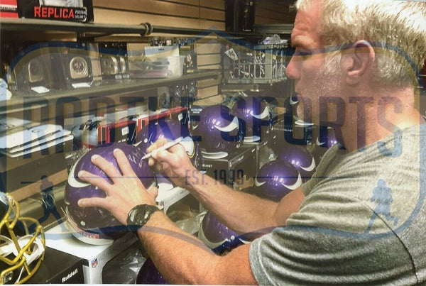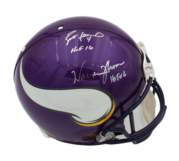 A Minnesota Vikings Speed Authentic NFL Helmet hand signed by Brett Favre & Warren Moon. The item and signature are in excellent condition. In addition to signing his name, Brett also inscribed "HOF" on the item. Brett was drafted into the NFL in 1991 Round:2 Pick:33. Brett Longest touchdowns pass:99 yards (Tied ). Brett Most Consecutive Starts:297 (321 including playoffs). AUTHENTIC ATION: The item is accompanied by a Brett Favre Exclusive Certificate of Authenticity, Brett Favre Exclusive Serial Numbered and Databased Hologram,-Picture of Brett & Warren from the Signing -