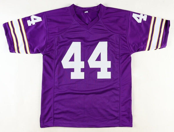 Custom on-field style jersey. Everything sewn on, size XL. Hand-signed by Chuck Foreman. Foreman's career highlights have been custom stitched onto the back of the jersey below the reverse numbers.The autograph(s) includes an official James Spence Authentication (JSA) hologram and matching COA for authenticity purposes. The signing of this item was witnessed by JSA.Authentication: JSA COA
