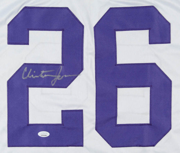 Custom on-field style jersey. Everything sewn on, size XL. Hand-signed in black felt-tip pen by Clinton Jones. The lot / autograph(s) includes an official James Spence Authentication (JSA) hologram and matching COA for authenticity purposes.Authentication: JSA COA