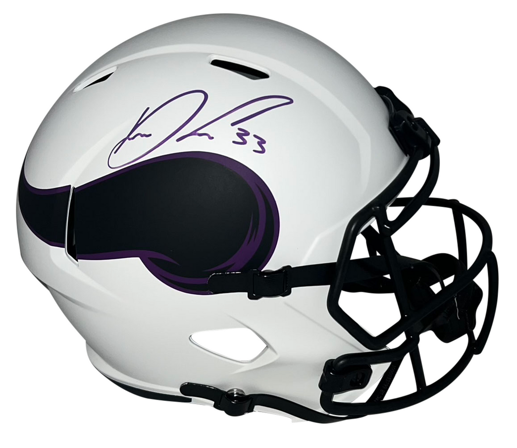 Dalvin Cook, star running back for the Minnesota Vikings, has hand signed this Vikings Riddell Speed Lunar full-size replica helmet at a private signing. This item comes with a certificate of authenticity (COA) from JSA - James Spence Authentication and was signed in the presence of one of their representatives. You will receive a serial-numbered COA along with a matching serial-numbered sticker on the helmet. The authenticity can be verified online by entering the serial number.Item pictured may not be the exact item you will receive. It will be similar quality, and we guarantee your satisfaction.