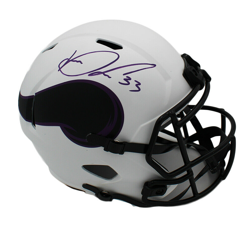 A Minnesota Vikings Speed Replica Lunar NFL Helmet hand signed by Dalvin Cook. The item and signature are in excellent condition. Dalvin is a running back for the Minnesota Vikings. He played college football at Florida State before being drafted in round 2 of the 2017 NFL Draft. He is a Pro Bowler, 2x First-team All-Pro, 2x First-team ALL-ACC & ACC Champion. AUTHENTICATION: The item is accompanied by a JSA Certificate of Authenticity - JSA Serial Numbered and Databased Hologram