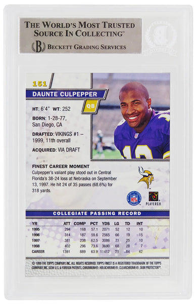 Daunte Culpepper signed Minnesota Vikings 1999 Topps Finest rookie football trading card #151. The card has been authenticated and encapsulated by Beckett Authentic and the authentication number can be verified online. The image of the item is a stock photo, as we may have multiples of the item in stock. The Slabbed Card you will receive will be of the card described. (Same grade, Same authentication) You may or may not receive the exact Beckett serial number on the slab label shown in image.