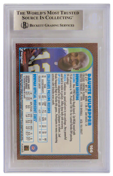 Daunte Culpepper signed Minnesota Vikings 1999 Bowman Chrome rookie football trading card #166. The card has been authenticated and encapsulated by Beckett Authentic and the authentication number can be verified online. The image of the item is a stock photo, as we may have multiples of the item in stock. The Slabbed Card you will receive will be of the card described. (Same grade, Same authentication) You may or may not receive the exact Beckett serial number on the slab label shown in image.