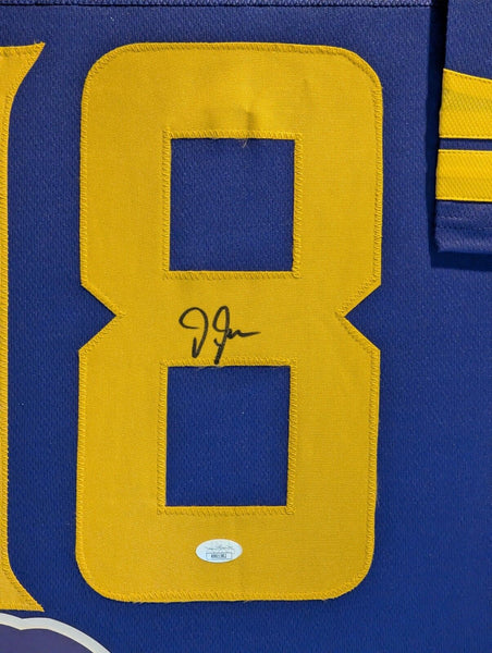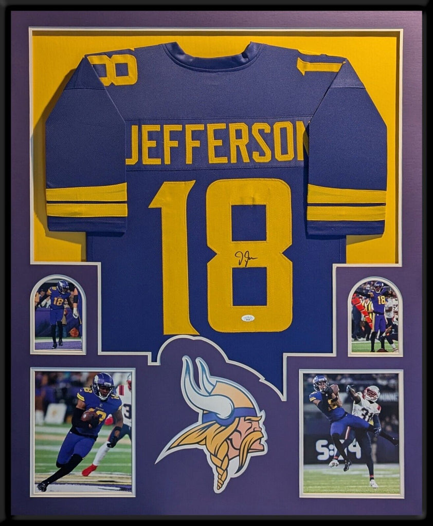 Custom Framed Justin Jefferson hand signed Minnesota Vikings style custom jersey.JSA Hologram and COAThe authentication is from JSA. This signature is authenticated by a representative of JSA! 100% AUTHENTIC!!! The jersey has fully stitched numbers on the front and back. It is a great item and a must for all great sports fans!Stock photos are used for auctions. Will receive equal quality.This item is professionally framed, it measures 32"x40" inside , 42"x34" outside , using UV protective Acrylic glass for safe keeping and safe transport, team color matting, black moulding and hanging hooks on the back. All additional items in frame seen in pictures included. 100% ready to hang in your fan cave.