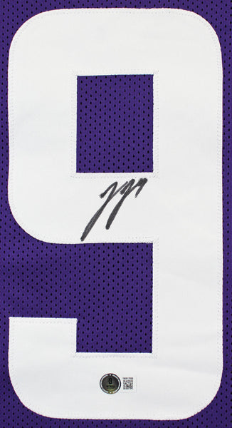 This Autographed Purple Pro Style Jersey has been Personally Signed by J.J. McCarthy of the Minnesota Vikings. This item is 100% Authentic to include a hologram by Beckett Authentication Services. This item will come with an affixed Beckett Authentication Services (BAS) authentication sticker, which includes a scannable QR code to verify authenticity. Please note that Beckett no longer provides serial-numbered COA cards, and the attached BAS sticker will serve as the complete authentication for this item. This is a BAS Witnessed Protection Program item which means a Beckett Authentication Service representative was present when this item was being signed. We conducted an autograph signing with J.J. McCarthy where multiples of the same item were signed. While the photographs are representative of this item, the size, placement and strength of the signature may vary. Each item is hand signed, therefore, each autograph is unique. This item can be verified through BAS Witnessed. This is a X-Large sized, non-branded, custom-stitched Jersey.