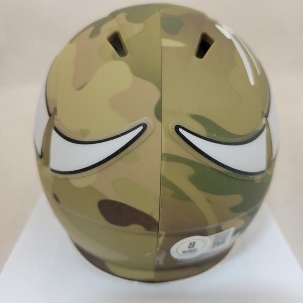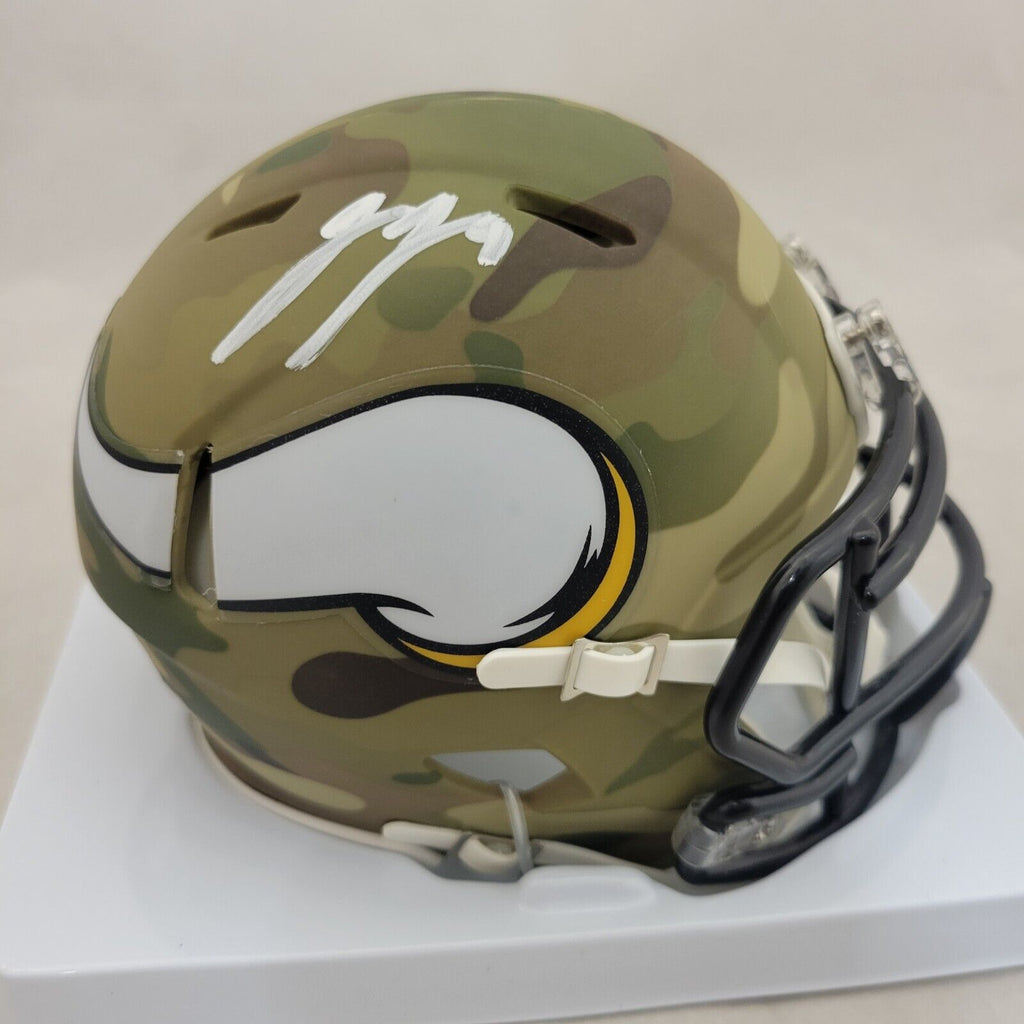 JJ MCCARTHY AUTOGRAPHED / SIGNED MINNESOTA VIKINGS CAMO SPEED MINI HELMET WITH BECKETT WITNESSED QR CODE HOLOGRAM COA