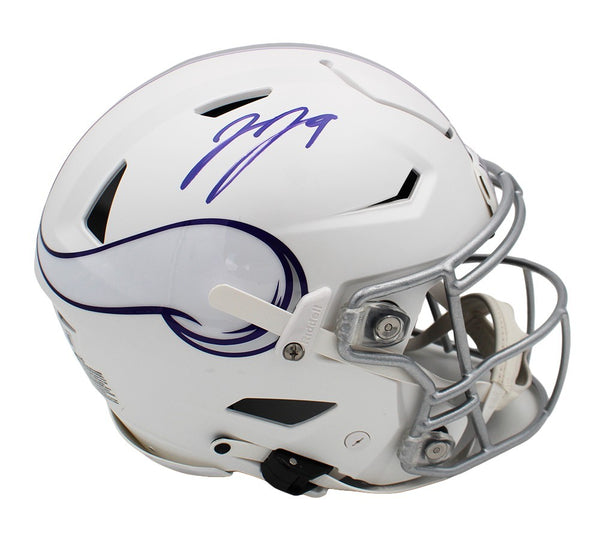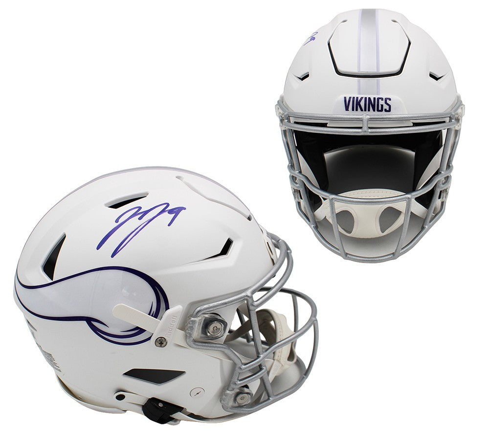 A Minnesota Vikings Speed Flex Authentic Alternate White NFL Helmet hand signed by JJ McCarthy. The item and signature are in excellent condition. JJ is a football quarterback who was drafted into the NFL in 2024 after playing college for the Michigan Wolverines. He was the Rose Bowl Offensive MVP and Big 10 Quarterback of the year. AUTHENTICATION: The item is tagged with a Beckett Serial Numbered and Databased Hologram.