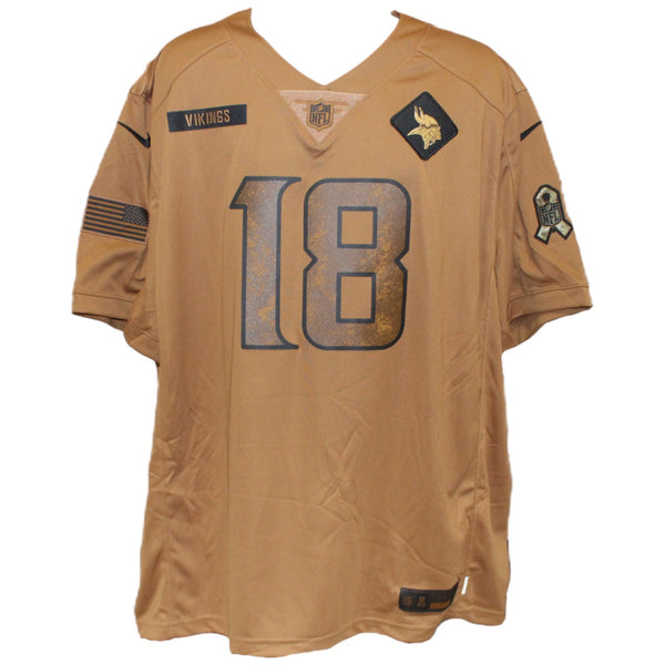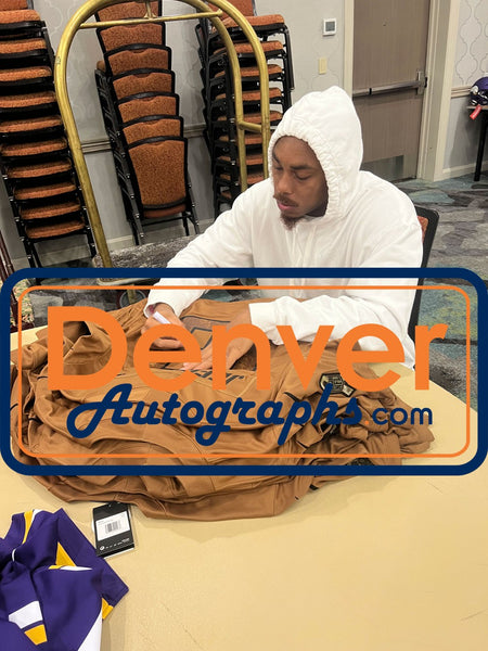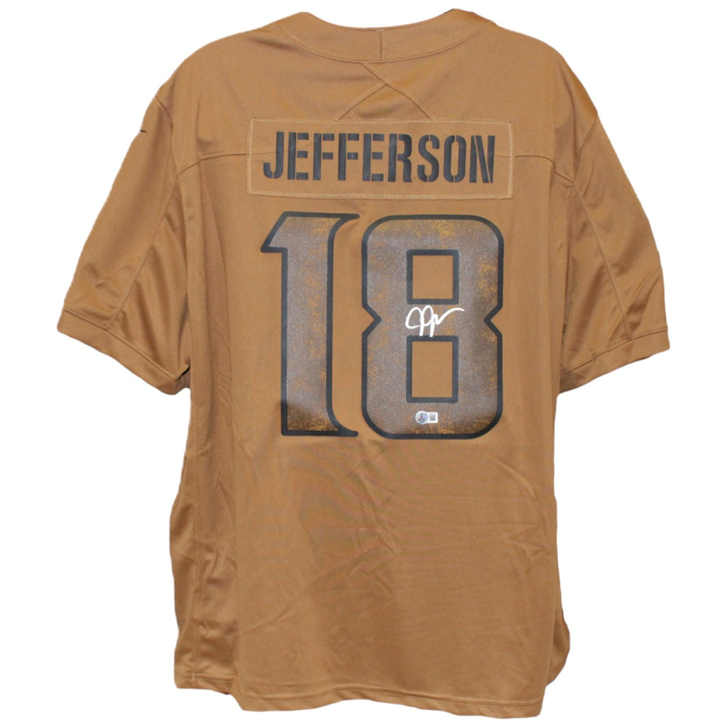 The number in the listing title is just an inventory sku for our records and is not the authentication number. The item pictured is a stock photo unless otherwise noted. This is a Minnesota Vikings Nike Size 3XL Brown Salute to Service Jersey that was personally autographed by Justin Jefferson. Includes a certificate of authenticity from Beckett Authentication Services (BAS) and Denver Autographs. FREE SHIPPING within the USA on orders over $10!
