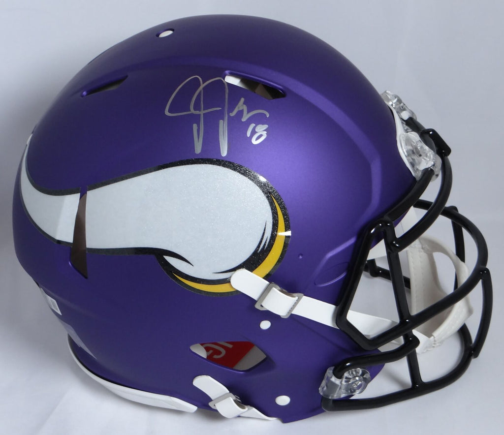This is a hand autograph of Justin Jefferson of the Minnesota Vikings on a Riddell Football Full Size Speed Authentic Helmet. This item has a Beckett Witnessed Authentication, which comes with a numbered sticker hologram and a QR code for verification. You can view this item on the Beckett Authentication website, and it shows when and where the item was signed. It was signed either at a public autograph appearance or a private signing. This is a stock photo of the item. Although you may not receive this exact item, the item you receive is virtually identical and brand new in great shape. This is a hand autograph of Justin Jefferson of the Minnesota Vikings on a Riddell Football Full Size Speed Authentic Helmet. This item has a Beckett Witnessed Authentication, which comes with a numbered sticker hologram and a QR code for verification. You can view this item on the Beckett Authentication website, and it shows when and where the item was signed. It was signed either at a public autograph appearance or a private signing. This is a stock photo of the item. Although you may not receive this exact item, the item you receive is virtually identical and brand new in great shape.