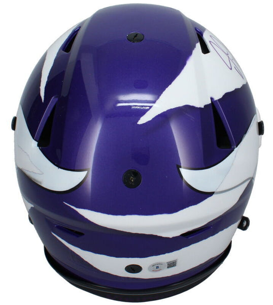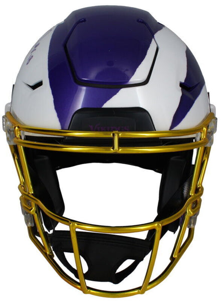 This ECC custom ripped Minnesota Vikings authentic SpeedFlex helmet has been personally hand-signed by Justin Jefferson. It comes with an individually numbered, tamper-evident hologram from Beckett Authentic. To ensure authenticity, the hologram can be reviewed online. This process helps to ensure that the product purchased is authentic and eliminates any possibility of duplication or fraud. This helmet needs to be seen in person to truly capture the detail in the custom painting. The autograph includes an official Beckett hologram for authenticity purposes.Comes with a tamper-evident hologram from Beckett Authenticated MONEY BACK GUARANTEE! If for any reason you are not completely satisfied with the quality or authenticity of your purchase, we will gladly give you a full refund or exchange, whichever you prefer up to 30 days after purchase. Please feel free to e-mail us with any questions. Thank you. Authenticator Pre-Certified Authenticator: Beckett Authenticated History of item: Justin Jefferson has signed this item in the presence of a representative from Beckett. Describe how you came to possess this item: Super Sports Center is a fully authorized dealer for Upper Deck Authenticated as well as Mounted Memories and Steiner Sports. Other information about you and / or the item: Super Sports Center strives to deliver the most authentic in sports memorabilia from trusted companies like Mounted Memories, Steiner Sports and Upper Deck Authenticated. If it exists, we can find it for you!