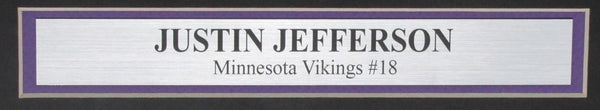 Justin Jefferson Vikings Signed/Autographed 16x20 Photo Framed. The outer frame dimensions 26.5 inch x 22.5 inch. This Photo is authenticated by Beckett and includes their Tamper-proof Hologram Sticker.