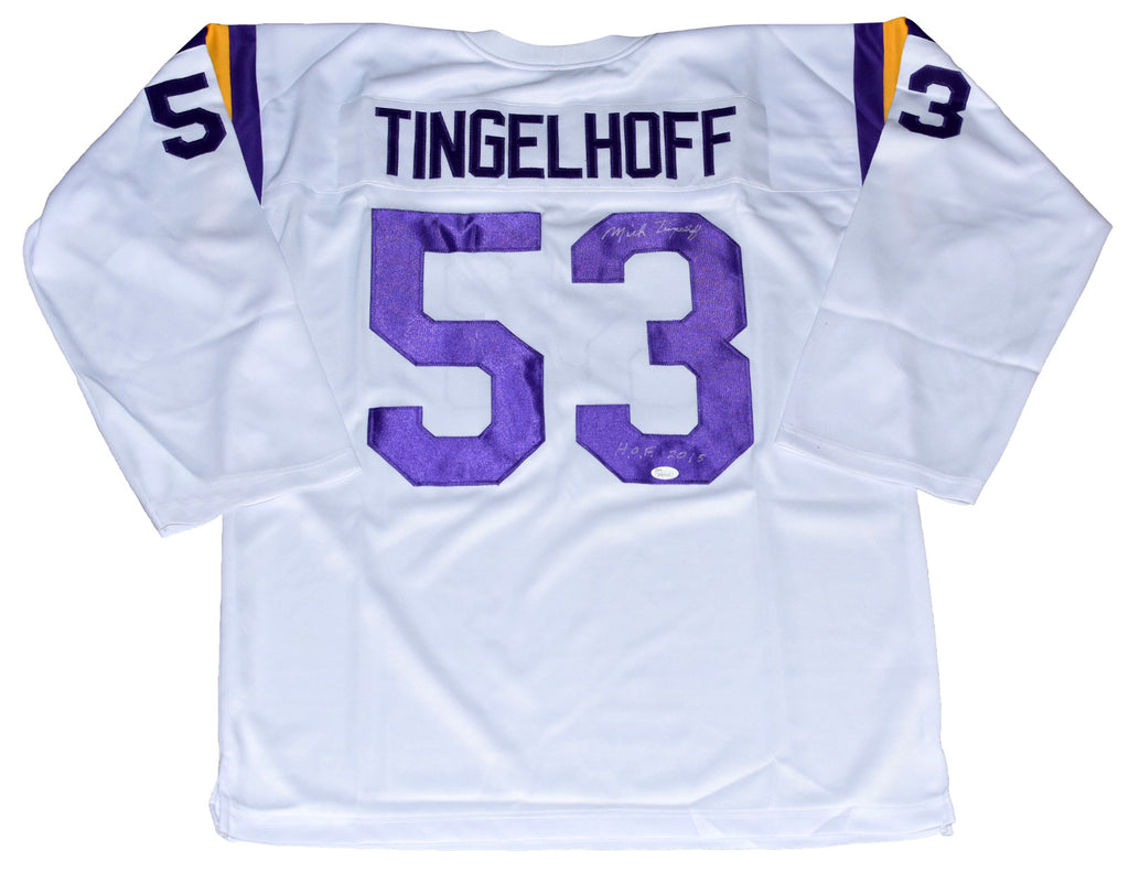 Mick Tingelhoff, former Hall of Fame center for the Minnesota Vikings, has hand signed this custom jersey at a private signing. He included the inscription "HOF 2015" with his signature. Jersey is size XL and all letters/numbers are sewn-on. This item comes with a certificate of authenticity (COA) from JSA - James Spence Authentication and was signed in the presence of one of their representatives. You will receive a serial-numbered COA along with a matching serial-numbered sticker on the jersey. The authenticity can be verified online by entering the serial number.Item pictured may not be the exact item you will receive. It will be similar quality, and we guarantee your satisfaction.