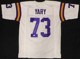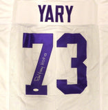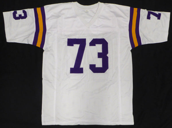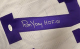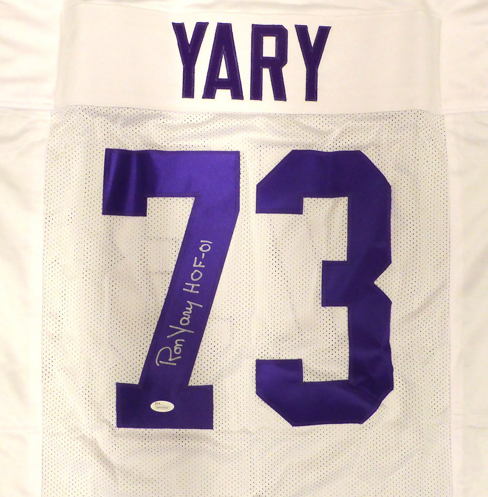 This is a White Jersey that has been hand signed by Ron Yary. This is a custom jersey with no name brand. The approximate size is XL. It has nice sewn in name and numbers. This item was inscribed "HOF 01." This item has been certified authentic by JSA and comes with their tamper-proof sticker and matching certificate of authenticity.