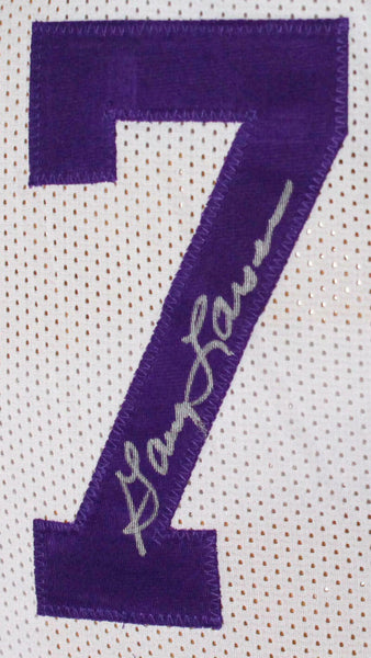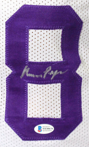 Purple People Eaters Autographed White Pro Style Jersey - Beckett W Auth *Silver THIS IS NOT AN NFL JERSEY. THIS HAS NO TAGS, NO LOGOS, NO EMBLEMS. These are the hand autographs of Gary Larson, Alan Page, Carl Eller, and Jim Marshall (also known as the Purple People Eaters) on a Custom Made (non name brand) Authentic Style Jersey with stitched letters and numbers. This item has a Beckett Witnessed Authentication, which comes with a numbered sticker and a matching Beckett Certificate of Authenticity. You can view this item on the Beckett Authentication website. It was signed either at a public autograph appearance or a private signing. This is a stock photo of the item. Although you may not receive this exact item, the item you receive is virtually identical and brand new in great shape. Jersey size is XL.