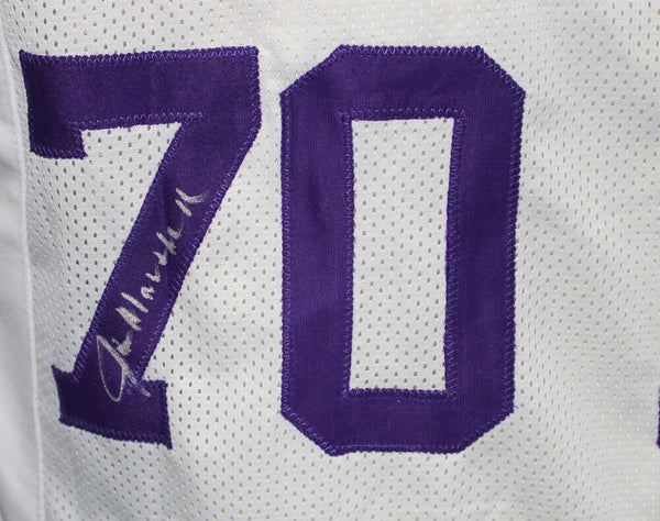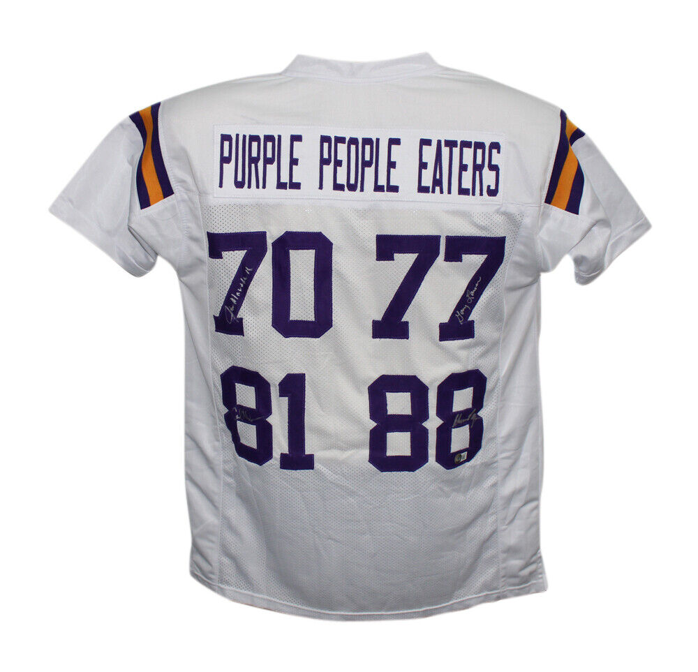 Purple People Eaters Signed Pro Style White XL Jersey 4 Sigs Beckett 37279 The number in the listing title is just an inventory sku for our records and is not the authentication number. The item pictured is a stock photo unless otherwise noted. This is a custom pro style purple XL jersey with sewn on name and numbers that was personally autographed by the 4 members of the Purple People Eaters: Carl Eller, Jim Marshall, Alan Page and Gary Larsen. Includes a certificate of authenticity from Beckett Authentication Services (BAS) and Denver Autographs.