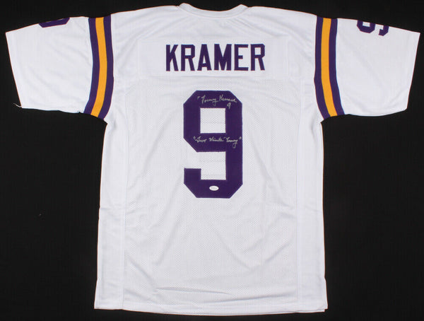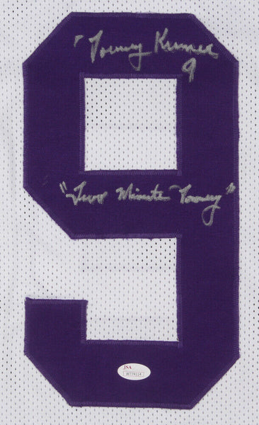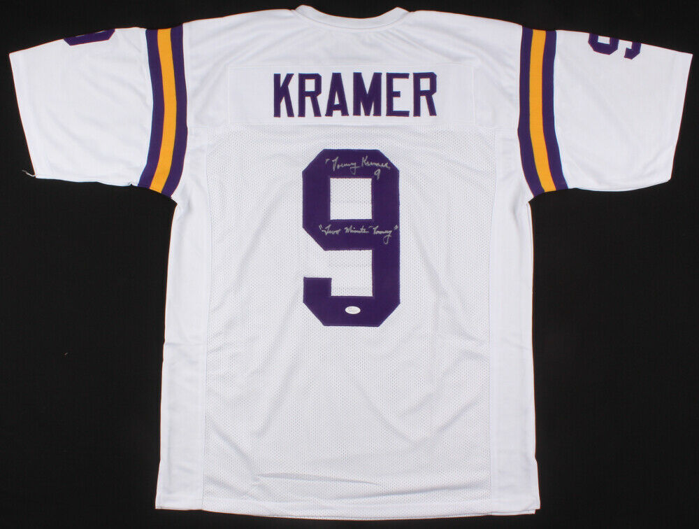 Custom on-field style jersey. Everything is sewn on, size XL. Hand-signed in silver felt tip pen by Tommy Kramer. The lot / autograph(s) includes an official James Spence Authentication (JSA) hologram and matching COA for authenticity purposes. The signing of this item was witnessed by JSA.Authentication: JSA COA