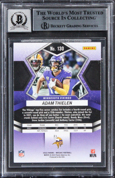 This Autographed Auto Graded Gem Mint 10! 2022 Panini Mosaic #130 Card has been Personally Signed by Adam Thielen of the Minnesota Vikings. This item is 100% Authentic, it comes slabbed and authenticated by Beckett Authentication Services. The authenticity can be verified on Beckett Authentication Services website.