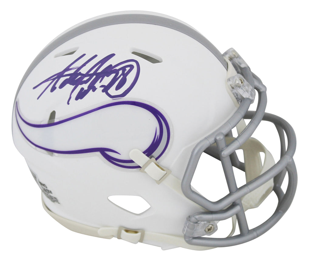 This Autographed 2024 On-Field Alternate Speed Mini Helmet has been Personally Signed by Adrian Peterson of the Minnesota Vikings. This item is 100% Authentic to include a hologram by Beckett Authentication Services. This item will come with an affixed Beckett Authentication Services (BAS) authentication sticker, which includes a scannable QR code to verify authenticity. Please note that Beckett no longer provides serial-numbered COA cards, and the attached BAS sticker will serve as the complete authentication for this item. This is a BAS Witnessed Protection Program item which means a Beckett Authentication Service representative was present when this item was being signed. We conducted an autograph signing with Adrian Peterson where multiples of the same item were signed. While the photographs are representative of this item, the size, placement and strength of the signature may vary. Each item is hand signed, therefore, each autograph is unique. This item can be verified through BAS Witnessed.