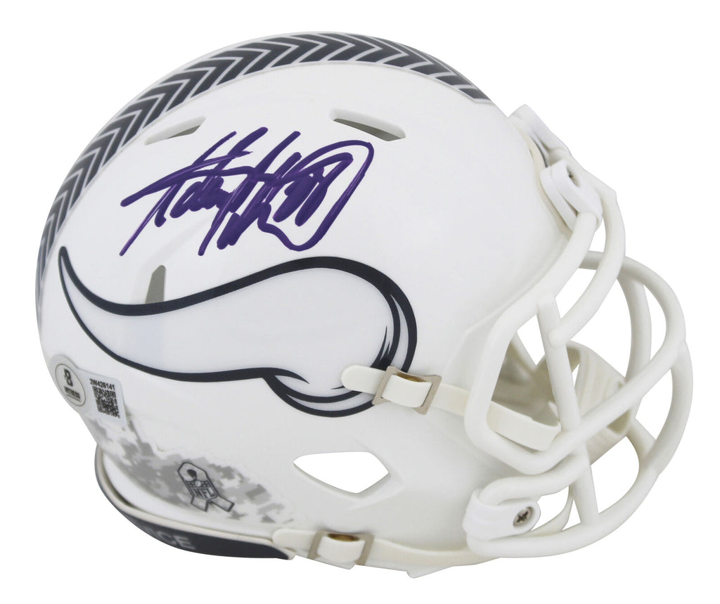 This Autographed Alternate 2024 Salute To Service III Speed Mini Helmet has been Personally Signed by Adrian Peterson of the Minnesota Vikings. This item is 100% Authentic to include a hologram by Beckett Authentication Services. This item will come with an affixed Beckett Authentication Services (BAS) authentication sticker, which includes a scannable QR code to verify authenticity. Please note that Beckett no longer provides serial-numbered COA cards, and the attached BAS sticker will serve as the complete authentication for this item. This is a BAS Witnessed Protection Program item which means a Beckett Authentication Service representative was present when this item was being signed. We conducted an autograph signing with Adrian Peterson where multiples of the same item were signed. While the photographs are representative of this item, the size, placement and strength of the signature may vary. Each item is hand signed, therefore, each autograph is unique. This item can be verified through BAS Witnessed.