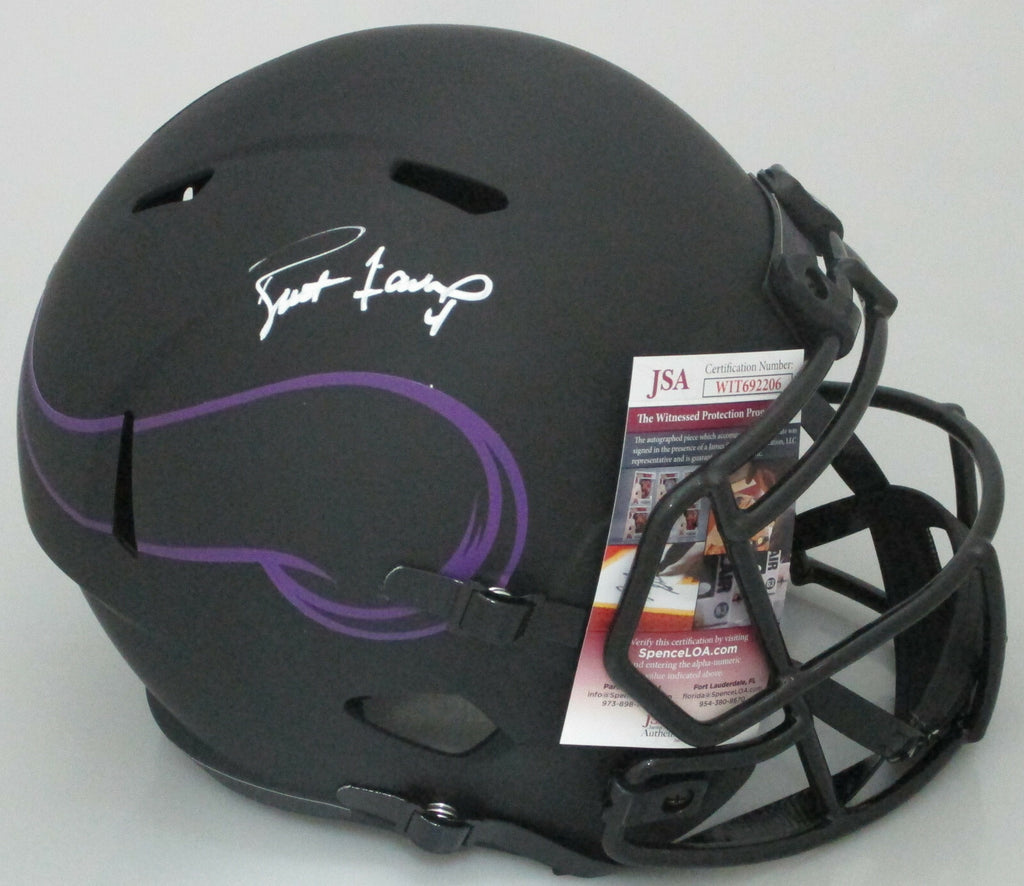 full size Riddell Replica ECLIPSE Speed Helmet hand signed by Minnesota Vikings Hall of Famer BRETT FAVRE. The signature is in White Paint Pen. This would make a great addition to any Vikings collection. This item was signed at a public signing with us. This item is guaranteed to be 100% authentic and will include a COA from JSA (James Spence Authentication).