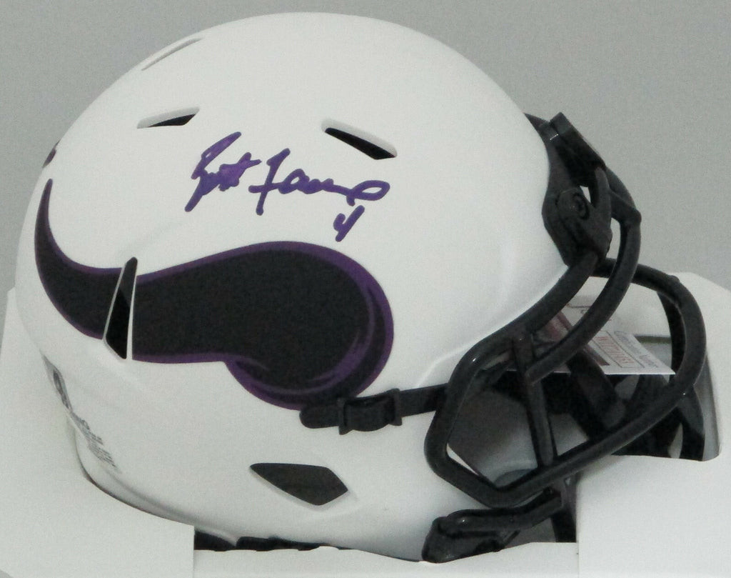 Riddell LUNAR Speed Mini Helmet hand signed by Minnesota Vikings Hall of Famer BRETT FAVRE. The signature is in Purple Paint Pen. This item was signed at a private signing and would make a great addition to any Vikings collection! This item is guaranteed to be 100% authentic and will include a COA from JSA authentication.