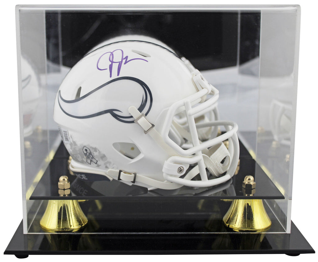 This Autographed Alternate 2024 Salute To Service III Speed Mini Helmet W/ Uv Mirrored Back Acrylic Display Case has been Personally Signed by Justin Jefferson of the Minnesota Vikings. This item is 100% Authentic to include a hologram by Beckett Authentication Services. This item will come with an affixed Beckett Authentication Services (BAS) authentication sticker, which includes a scannable QR code to verify authenticity. Please note that Beckett no longer provides serial-numbered COA cards, and the attached BAS sticker will serve as the complete authentication for this item. This is a BAS Witnessed Protection Program item which means a Beckett Authentication Service representative was present when this item was being signed. We conducted an autograph signing with Justin Jefferson where multiples of the same item were signed. While the photographs are representative of this item, the size, placement and strength of the signature may vary. Each item is hand signed, therefore, each autograph is unique. This item can be verified through BAS Witnessed.