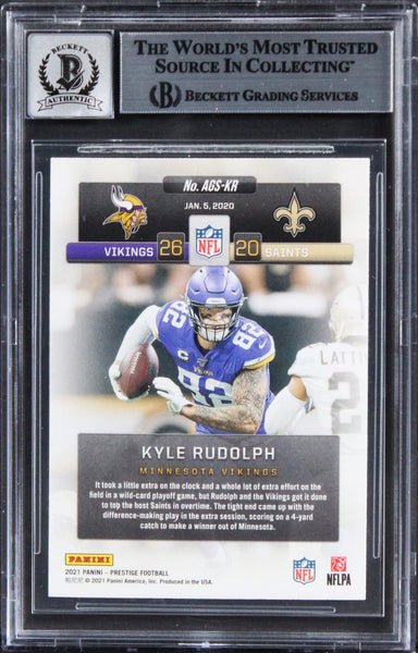 This Autographed Auto Graded Gem Mint 10! 2021 Prestige Any Given Sunday #6 Card has been Personally Signed by Kyle Rudolph of the Minnesota Vikings. This item is 100% Authentic, it comes slabbed and authenticated by Beckett Authentication Services. The authenticity can be verified on Beckett Authentication Services website.