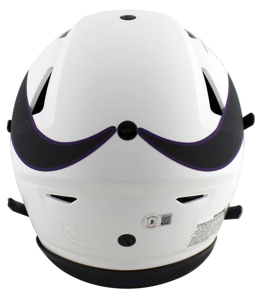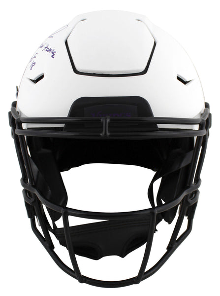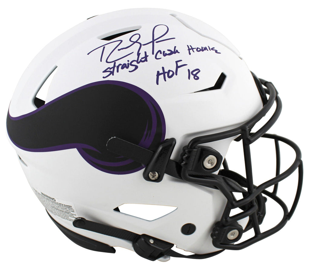 This Autographed Alternate Lunar Authentic Riddell Speed Flex Full Size Helmet with the inscription of "Straight Cash Homie, HOF 18" has been Personally Signed by Randy Moss of the Minnesota Vikings. This item is 100% Authentic to include a hologram by Beckett Authentication Services. This item will come with the new Beckett Authentication hologram that has a scannable QR code rather than the traditional COA. If you would like to have a COA, you are welcome to reach out to Beckett for a printed certification once you receive your item. This is a BAS Witnessed Protection Program item which means a Beckett Authentication Service representative was present when this item was being signed. We conducted an autograph signing with Randy Moss where multiples of the same item were signed. While the photographs are representative of this item, the size, placement and strength of the signature may vary. Each item is hand signed, therefore, each autograph is unique. This item can be verified through BAS Witnessed.