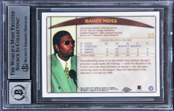 This Autographed Auto Graded Gem Mint 10! 1998 Topps Chrome #35 Rookie Card has been Personally Signed by Randy Moss of the Minnesota Vikings. This item is 100% Authentic, it comes slabbed and authenticated by Beckett Authentication Services. We have multiples of this same item. While the photographs are representative of this item, the size and placement of the signature may vary. Each item is hand signed, therefore, each autograph is unique.