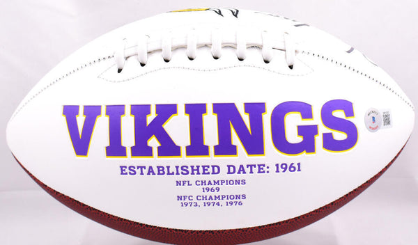 Warren Moon Autographed Minnesota Vikings Logo Football w/HOF- Beckett W Hologram *Black *Left This is a Hand Autographed Logo Football of Warren Moon of The Minnesota Vikings. Inscribed HOF. This item has a Beckett Witnessed Authentication, which Comes with a Beckett #'ed hologram and a QR code for verification. You can view this item on the Beckett website and it shows when and where the item was signed. It was signed either at a public autograph appearance or a Private Signing. This is a stock photo of the item. Although you may not receive this exact item, the item you receive is virtually identical and brand new in great shape.