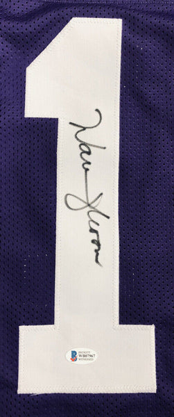 Custom on-field style jersey. Everything is sewn on, size XL. Has been hand-signed in black felt-tip pen by Warren Moon (HOF). The lot / autograph(s) includes an official Beckett Authentication Services serially-numbered hologram and matching COA for authenticity purposes. The signing of this item was witnessed by Beckett.Authentication: Beckett COA