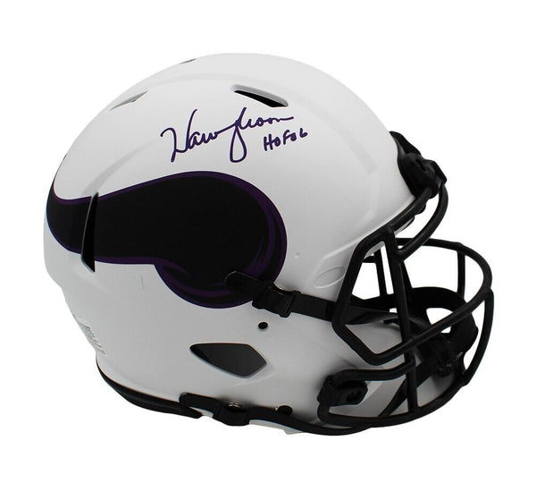 A Minnesota Vikings Speed Authentic Lunar NFL Helmet hand signed by Warren Moon. The item and signature are in excellent condition. In addition to signing his name, Warren also inscribed "HOF 06" on the item. Warren is a retired player who is in the Texas Sports Hall Of Fame, has been awarded the Titans Ring of Honor, and the Bart Starr Award. AUTHENTICATION: Your item has been tagged with a SmarTag powered by Prova technology, which gives you digital access to your items authentication records, including a proof picture from the signing.