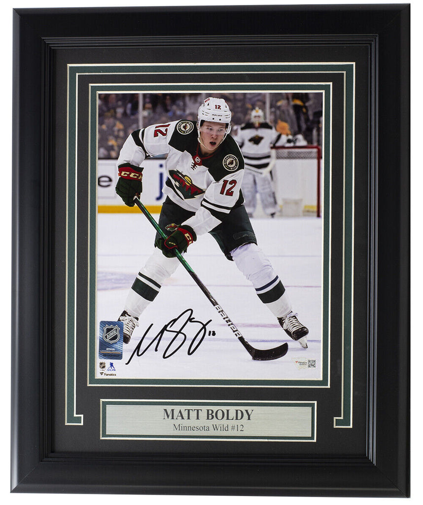 Featured is a Matt Boldy signed framed 8x10 Minnesota Wild photo. This photo was hand signed by Matt Boldy and has been authenticated by Fanatics authentication services. Included with the photo is a Fanatics hologram and certificate of authentication. Brand new professional framing featuring double matting and an engraved nameplate. The frame measures approximately 11x14 in total size and it is ready for display. This photo would make a great addition to any sports memorabilia collection. SPECIFICATIONS Autographed By: Matt Boldy Team: Minnesota Wild Sport: Hockey-NHL Authentication: Grey Flannel