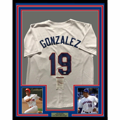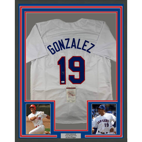 Framed Autographed/Signed Juan Gonzalez 35x39 Texas White Jersey JSA COA