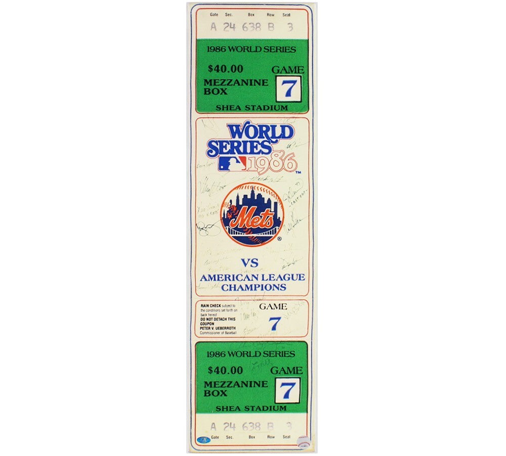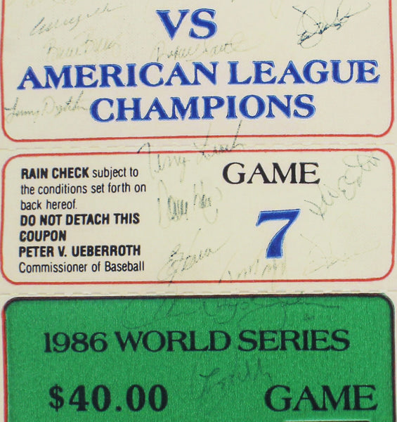 A 1986 World Series Mega Ticket Canvas hand signed by 25 1986 New York Mets Team Alumni including Gary Carter, Darryl Strawberry, Barry Lyons, Lenny Dykstra, Ray Knight, Jesse Orosco, Dwight Goodne, Mookie Wilson, Terry Leach, Rafael Santana, Wally Backman, Ed Hearn and more. The signatures and item are in excellent condition. The canvas measures 9"x33". AUTHENTICATION: The item is accompanied by MAB Celebrity Serial Numbered and Databased Hologram