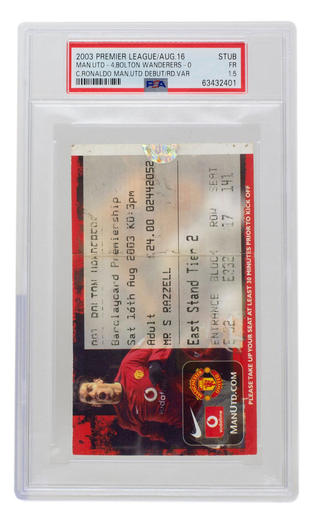 Featured is a 2003 Manchester Cristiano Ronaldo rookie debut game slabbed ticket stub. This ticket has been slabbed and authenticated by PSA authentication services, and have graded the ticket a Fair 1.5. This ticket would make a great addition to any entertainment memorabilia collection.. SPECIFICATIONS Autographed By: Team: Manchester United Sport: Soccer Authentication: Professional Sports Authenticator (PSA)