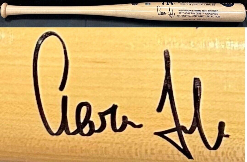 Aaron Judge hand signed Rookie stat bat. Hand signed in bold black. #99 Aaron Judge won the 2017 AL rookie of the year award. Bat lists his stats and accolades from that season. Judge would go on to win the AL MVP in 2022 and 2024. Bat is thicker with a long barrel. 33 inches long. RARE rookie bat.