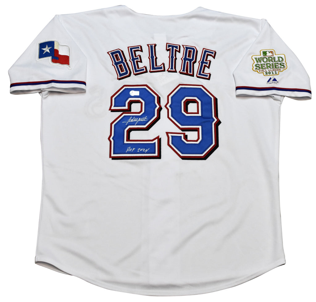 Adrian Beltre, former Hall of Fame third baseman for the Texas Rangers, has hand signed this white Majestic jersey with the 2011 World Series patch. He included the inscription "HOF 2024" with his signature. Jersey is new with tags attached and everything is sewn-on. This item is authenticated by Beckett Authentication Services and was signed in the presence of one of their representatives. Their tamper-evident hologram featuring a QR code and serial number is on the item. The authenticity can be verified online by entering the serial number or scanning the QR code.Item pictured may not be the exact item you will receive. It will be similar quality, and we guarantee your satisfaction.