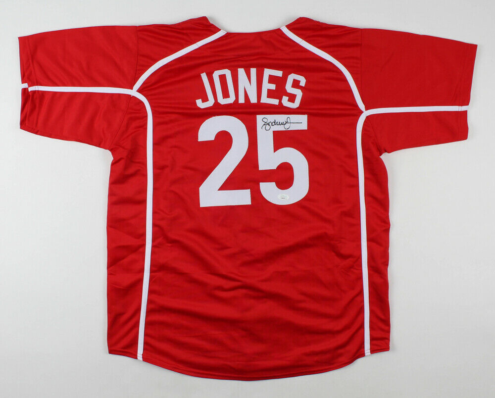 Custom on-field style jersey. Everything is sewn on, size XL. Hand-signed by Andruw Jones.The lot / autograph(s) includes an official James Spence Authentication (JSA) hologram and matching COA for authenticity purposes.Authentication: JSA COA