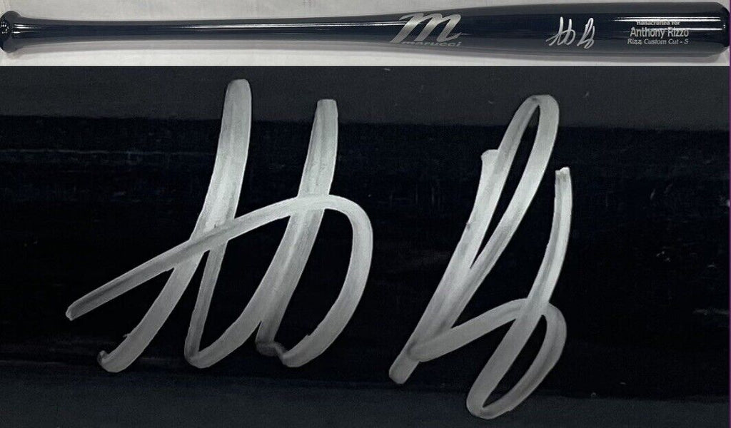 Anthony Rizzo Hand Signed Marucci Game Model Bat Autograph Yankees Fanatics MLB COA. Marucci black custom bat 33" handcrafted for Anthony Rizzo. Hand signed in bold silver that pops nicely on the bat. Custom Cut-S. Clean black bat with silver lettering. Yankees first baseman and WS Champion with the Cubs! You get this exact bat.