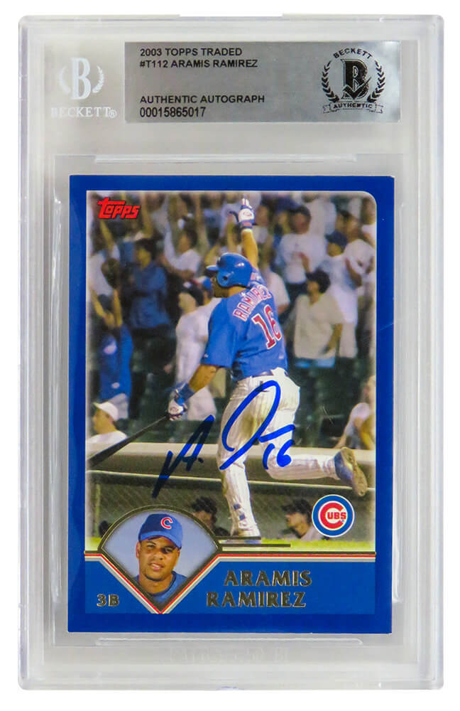 Aramis Ramirez signed Chicago Cubs 2003 Topps Traded baseball card #T112. The card has been authenticated and encapsulated by Beckett Authentic and the authentication number can be verified online. The image of the item is a stock photo, as we may have multiples of the item in stock. The Slabbed Card you will receive will be of the card described. (Same grade, Same authentication) You may or may not receive the exact Beckett serial number on the slab label shown in image.