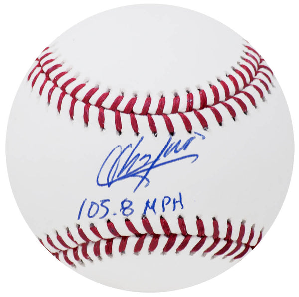 Aroldis Chapman signed Rawlings official MLB baseball with '105.8 MPH' inscription. Item comes with a Schwartz Sports Memorabilia tamper-proof numbered hologram and Certificate of Authenticity which can be verified online.
